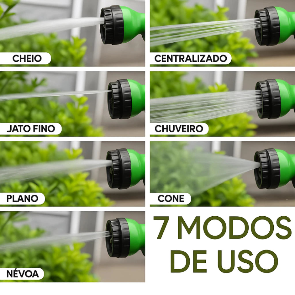 Versatilidade de jatos: acompanha gatilho com até 7 ajustes de jato de água (como Full, cone, shower, jet, mist etc.), ideal para regas delicadas ou limpeza potente.