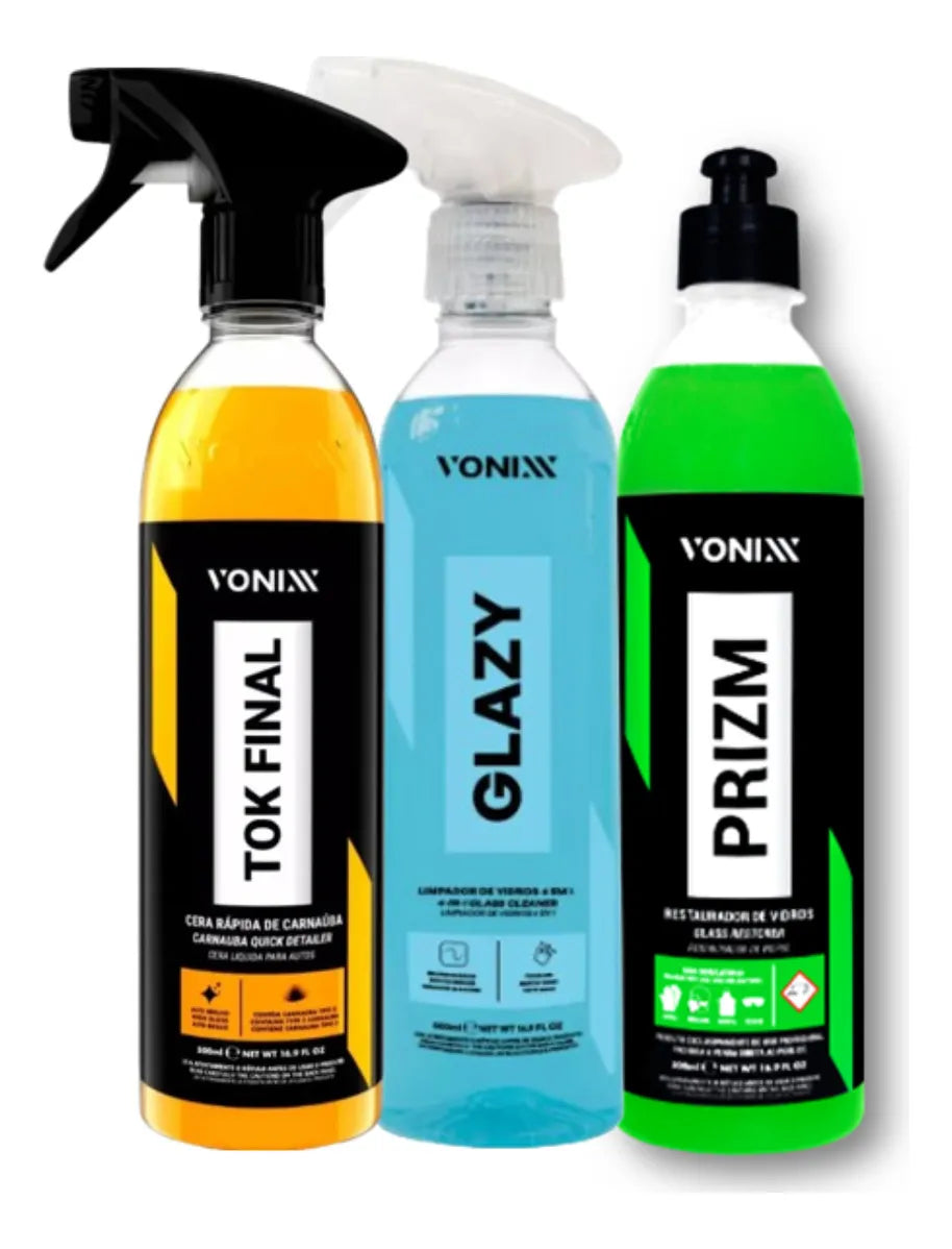 Com o Kit Vonixx Glazy + Tok Final + Prizm, você tem tudo para deixar seu carro impecável, com vidros cristalinos e pintura protegida como se tivesse passado por uma estética profissional.